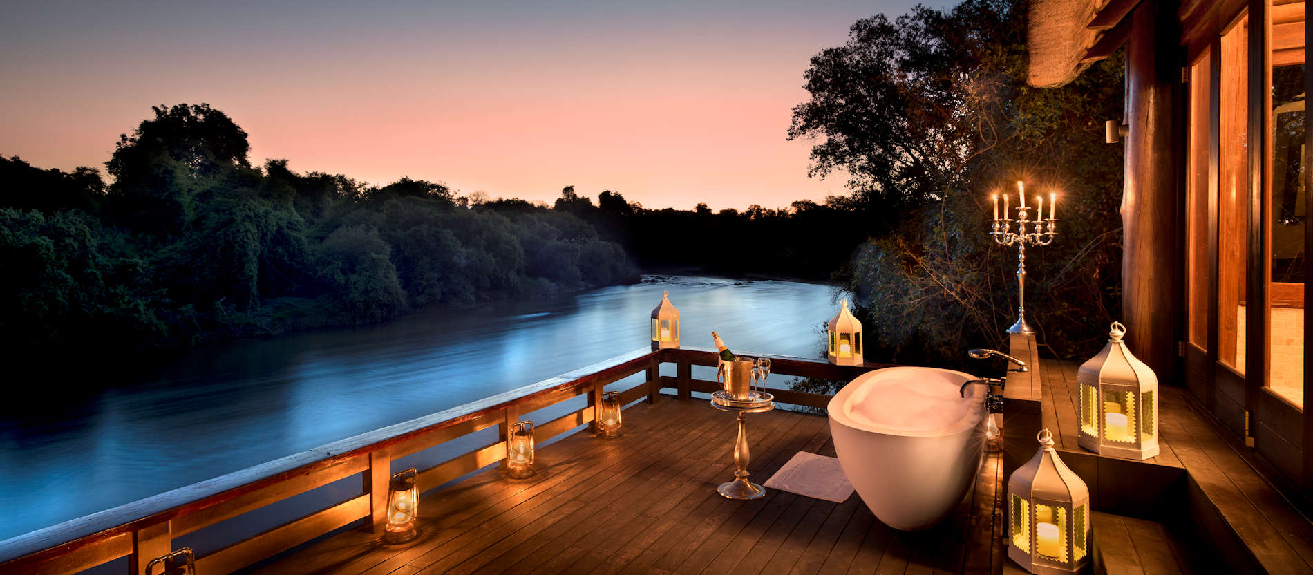 Es gibt vier Gästevillen. Alle befinden sich am Ufer der Insel und sind erhöht, um den Blick auf den Sambesi zu maximieren. Die Innenräume sind exquisit gestaltet, mit rustikal-schicken Möbeln und eleganter Beleuchtung inmitten von Fluss- und Erdtönen. Der offene Schlaf- und Wohnbereich enthält ein Doppelbett mit Moskitonetz, Nachttische und Lampen, zwei Truhen am Fußende des Bettes und ein paar Plüschsessel. Außerdem gibt es einen kleinen Esstisch mit Stühlen für private Mahlzeiten. Zu den weiteren Annehmlichkeiten im Zimmer gehören eine Klimaanlage, ein Ventilator, eine Minibar und ein Safe, und das eigene Bad bietet eine Toilette mit Wasserspülung, zwei Waschbecken und eine begehbare Dusche. Vom Wohn- und Schlafbereich aus führen Türen auf ein geräumiges privates Deck, auf dem Sie zusätzliche Sitz- und Essmöbel sowie eine Badewanne vorfinden! Dies ist der perfekte Ort, um sich zu entspannen und dabei den Blick auf den Fluss zu genießen.