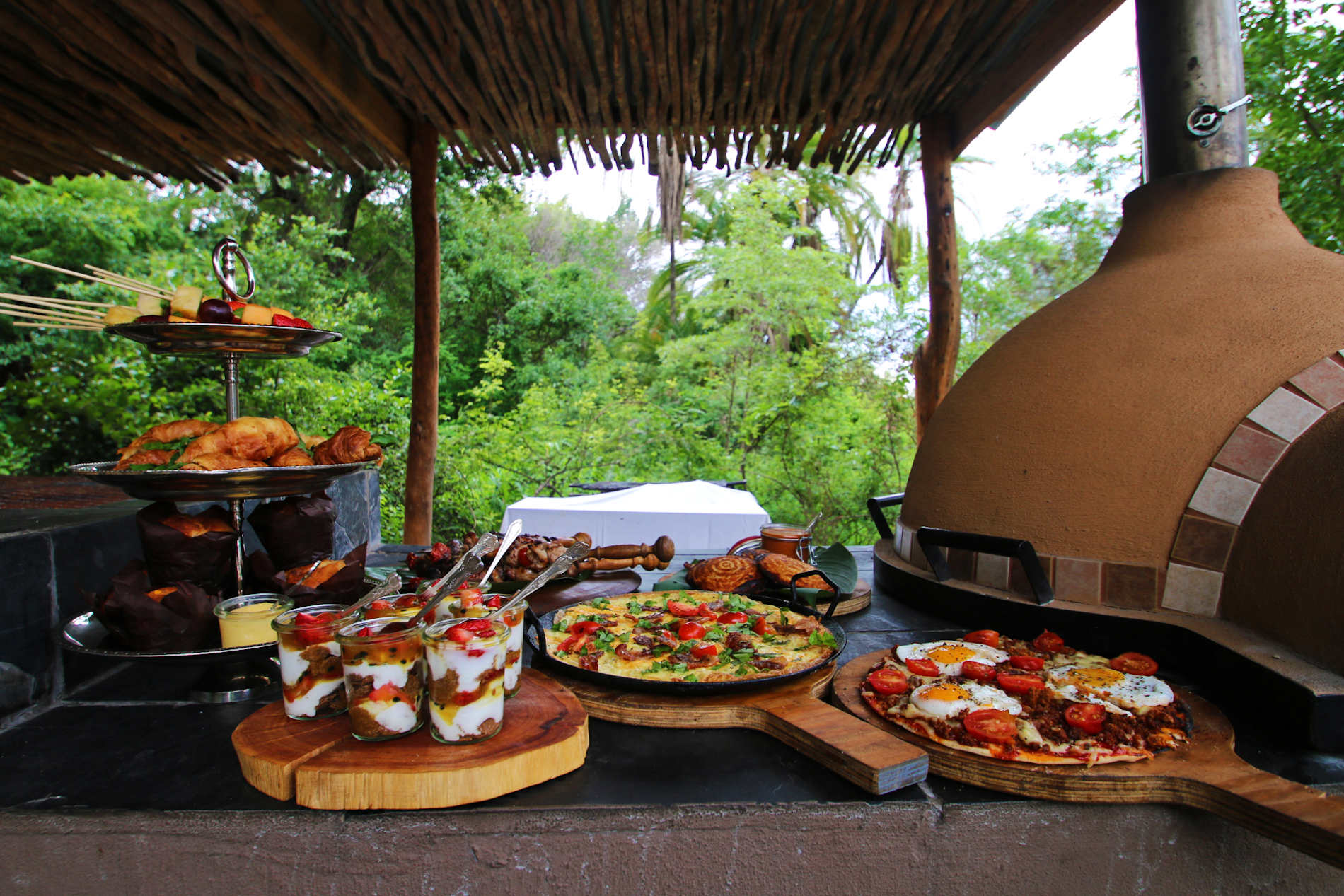 In einer attraktiven Struktur aus Holz und Stroh befindet sich die charmante Lounge mit Sitzgelegenheiten aus Leder und Wildleder, Sitzsäcken und sogar Schaukelsitzen um Kaffee- und Beistelltische. Dieser Bereich wird teilweise durch eine auffällige Wand mit einem gemütlichen Kamin geteilt. Das Restaurant der Lodge grenzt an die Lounge und ist mit separaten Tischen und Stühlen ausgestattet, an denen leckere Mahlzeiten serviert werden, begleitet von Getränken aus der gut bestückten Bar. Diese Räume gehen auf geräumige Decks hinaus, die zusätzliche Lounge- und Essmöbel sowie einen herrlichen Blick auf den Fluss bieten! An einer Seite des Hauptgebäudes befindet sich die Feuerstelle, an der sich die Gäste treffen, um ihre Erfahrungen auszutauschen. Und am äußersten Rand des Flussufers befindet sich ein Swimmingpool, in dem Sie sich abkühlen und die schönsten Ausblicke auf das Wasser genießen können.