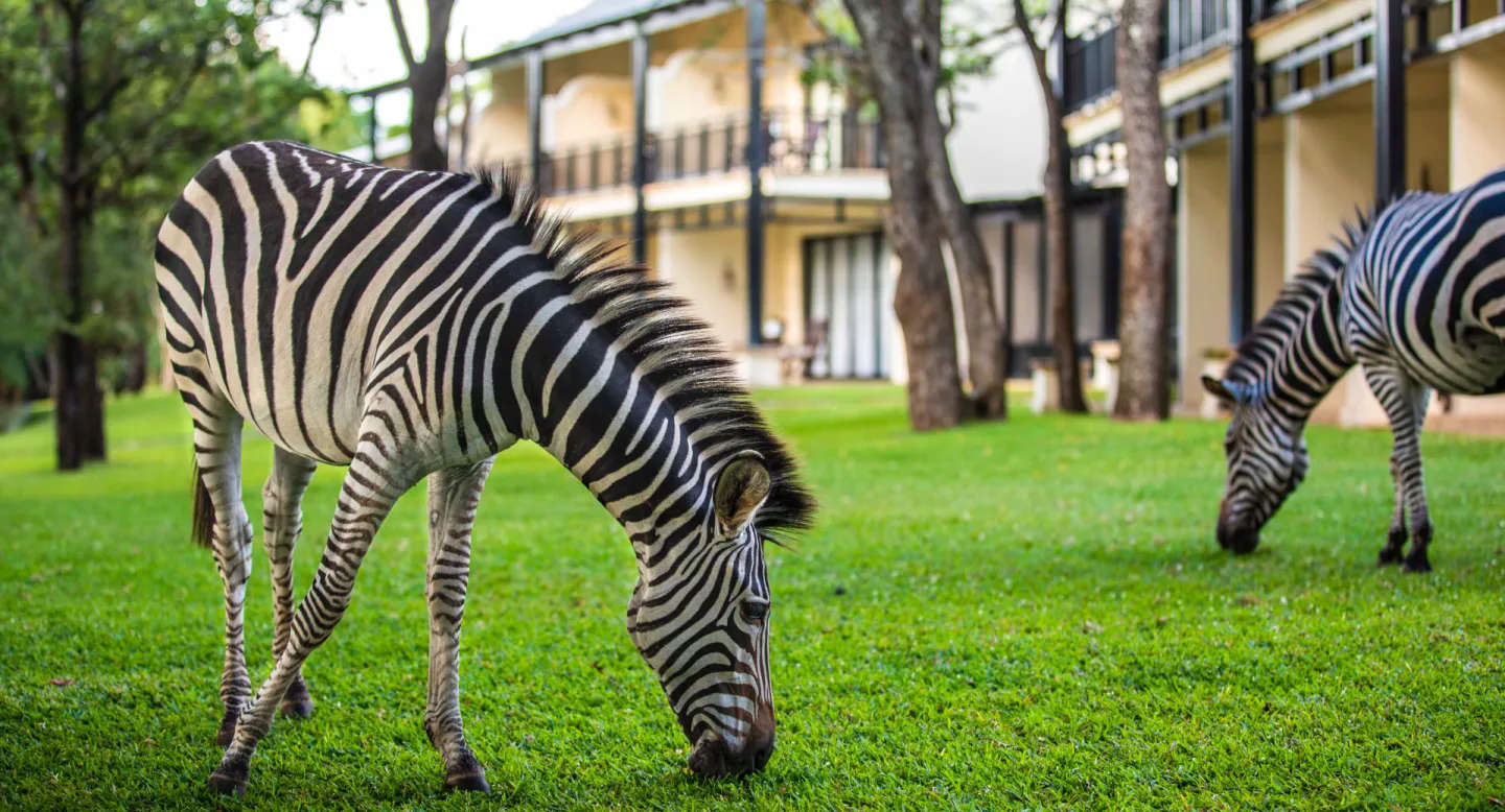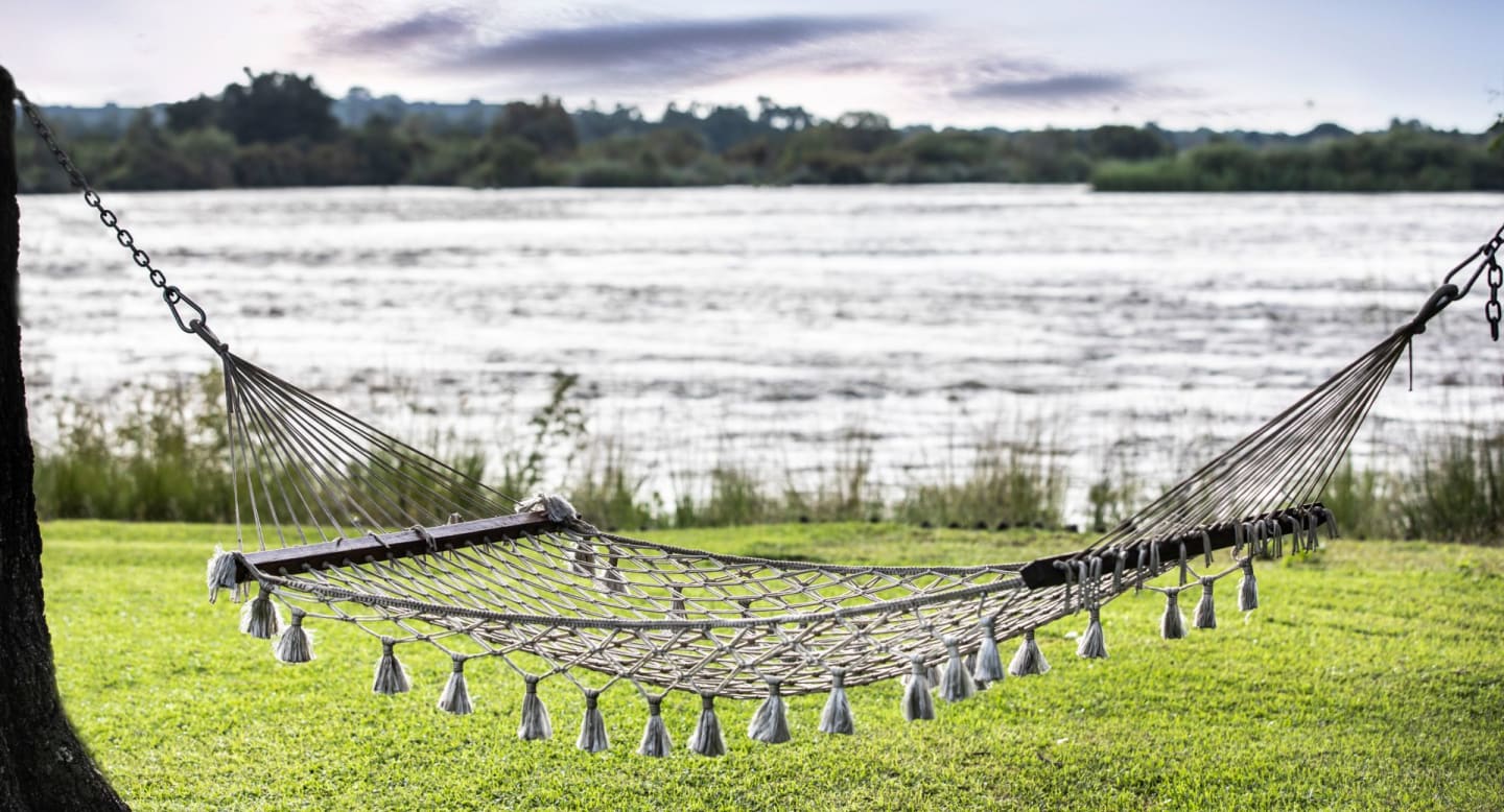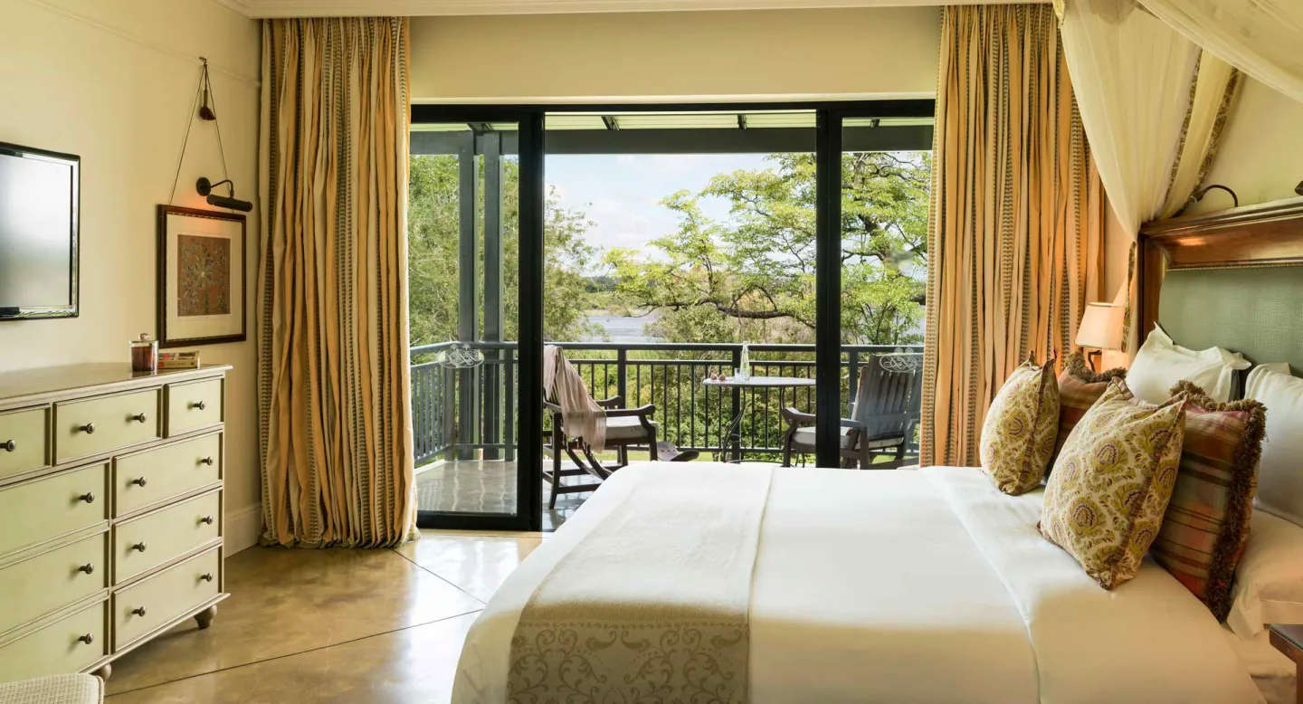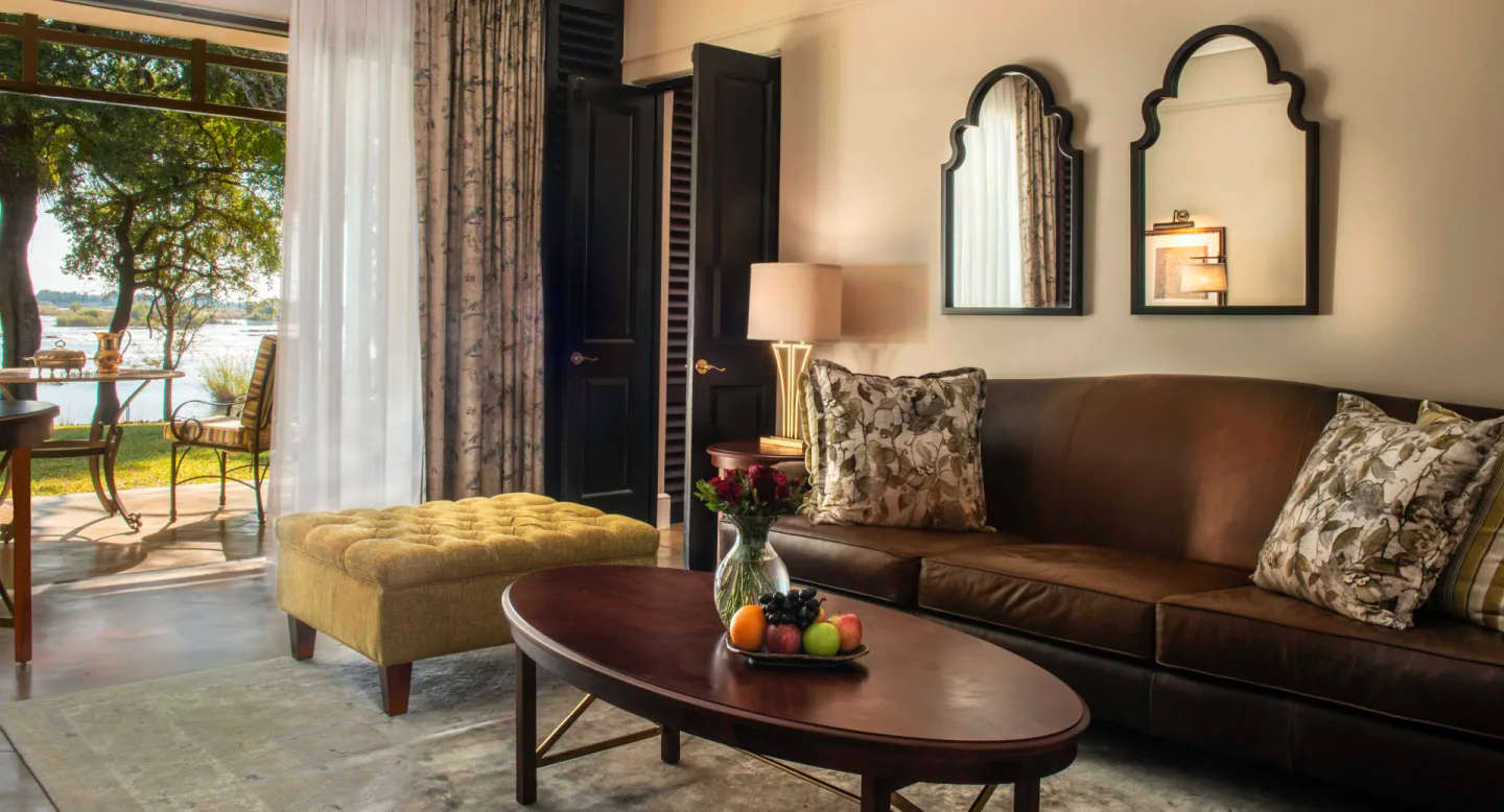 Das 5-Sterne-Hotel Royal Livingstone – in einem kolonialen Stil gehalten- liegt inmitten eines Landschaftsgartens am Ufer des Sambesi-Flusses, nur 15 Gehminuten von den Victoriafällen entfernt. Bei höheren Wasserständen kann man vom Hotelgelände aus oft die Gischt der Fälle sehen.