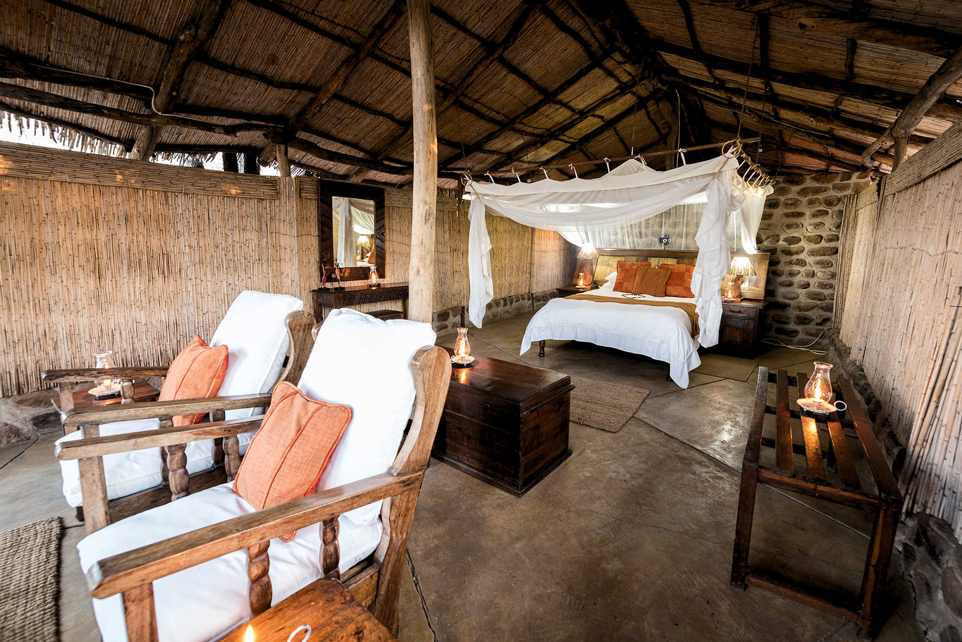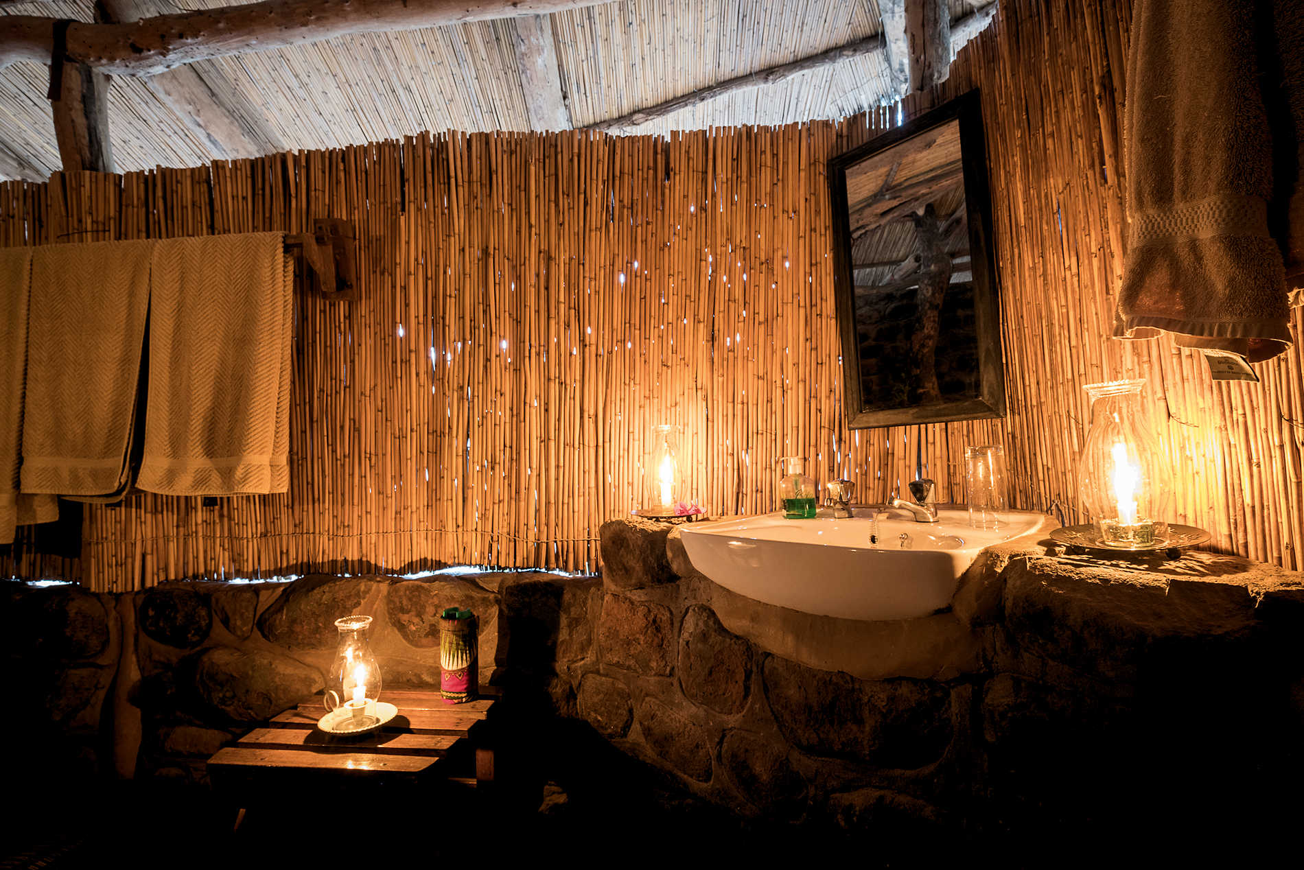 Jedes Chalet verfügt über einen eigenen abgelegenen Garten und eine Außendusche sowie einen Innenraum, eine Steindusche und ein Badezimmer. Die Einrichtung ist einfach, aber stilvoll, mit einem Hauch von handgefertigtem Kunsthandwerk und natürlichen Elementen, die im Einklang mit der umgebenden Wildnis stehen. Alle Chalets wurden mit lokalen Materialien entworfen und gebaut, mit Steinen aus der Schlucht und Schilfrohr aus dem Fluss. In den Wintermonaten werden abends Wärmflaschen in die Betten gelegt und im Sommer werden die Zimmer mit Moskitospulen beleuchtet. Mit Steinen und Laternen gesäumte Wege führen von der Hauptlodge zu den abgelegenen Chalets, die sich in den Busch schmiegen.
