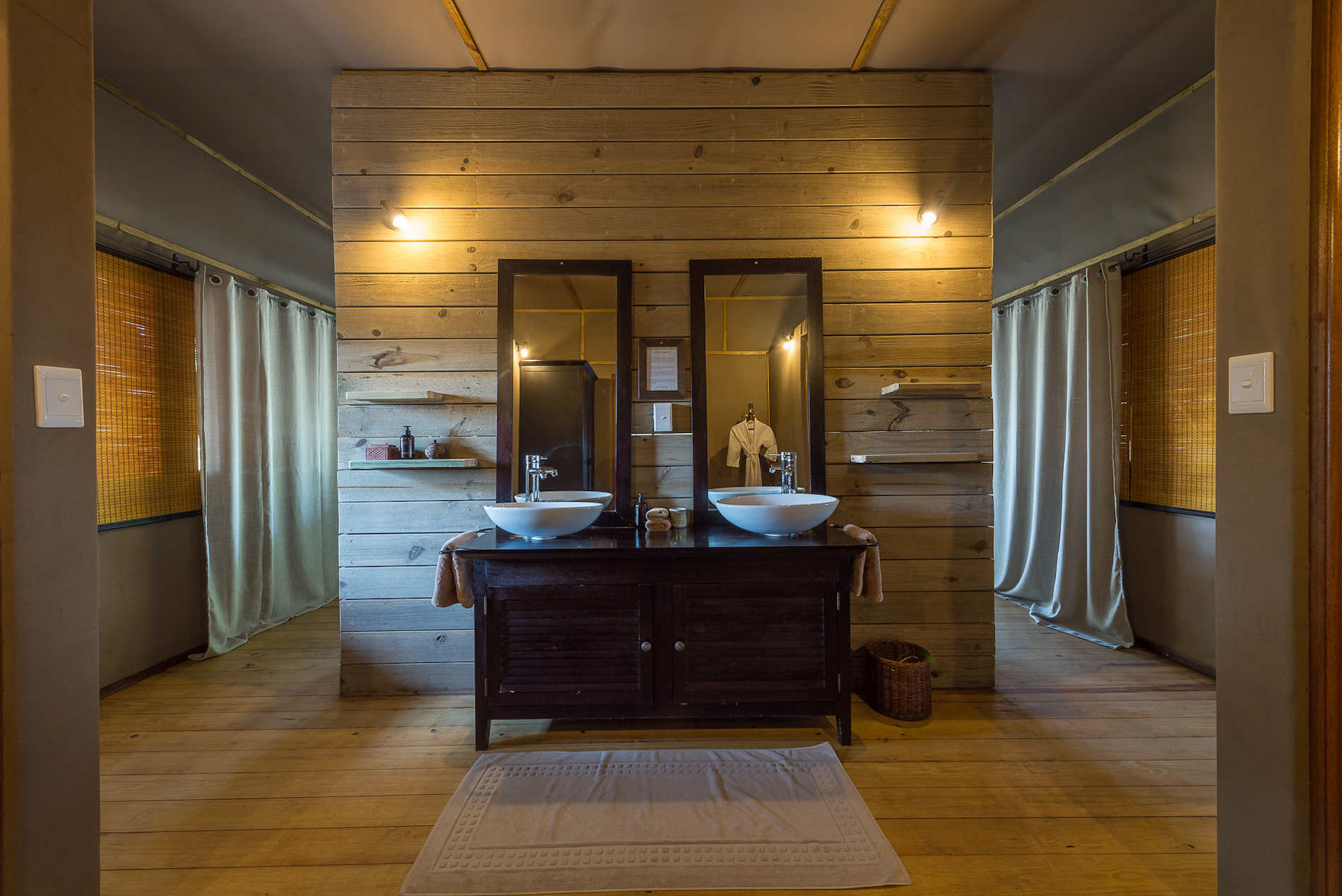Die Atmosphäre ist wunderschön: Man hört das Rauschen des Flusses – direkt vor dem Camp gibt es kleinere Stromschnellen. Im Hauptbereich befindet sich ein offenes Restaurant mit Bar, alles ist dezent edel, im typischen „Wilderness Safaris“-Stil gestaltet. Highlight ist aber ohne jeden Zweifel die nahezu kreisrunde Terrasse direkt über dem Fluss, in die ein Großer Baum wächst. Von hier gelangt man über einige Stunden zum Feuerplatz respektive Boma des Camps, direkt am Wasser.