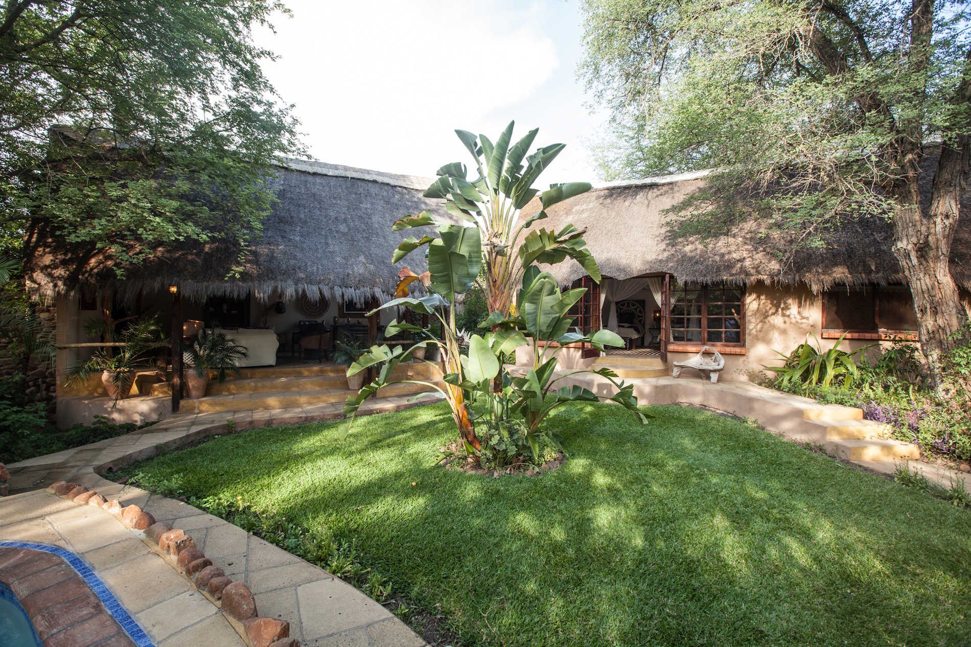 Das einzigartige und offene Design des Hauses garantiert den Gästen eine der besten Aussichten Afikas. Jedes Haus und Cottage in Tongabezi hat seinen eigenen Hausdiener, der für einen komfortablen Aufenthalt sorgen wird. Jeder Hausdiener hat außerdem ein detailliertes Wissen über Tongabezi und das umliegende Gebiet. Der Swimmingpool des Camps liegt in einem natürlichen Kliff und die Mahlzeiten werden in einem großen Speiseraum oder auf einem Deck, das den Fluss überschaut, serviert.