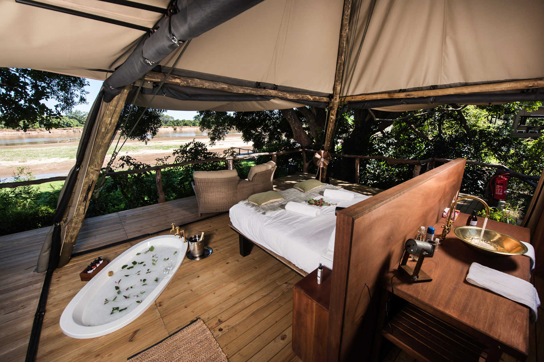 Die Shawa Luxury Couples Tents verschmelzen mit der Stille und dem Grün der umliegenden Bäume und schaffen so natürliche Privatsphäre und Frieden – es ist Ihr eigener Platz in der Wildnis von South Luangwa. Sie sind nie weit von den Sehenswürdigkeiten und Geräuschen des afrikanischen Busches entfernt. Zwischen den morgendlichen und abendlichen Safari-Aktivitäten können Sie sich die Zeit auf Ihrer Terrasse am Flussufer vertreiben und beobachten, wie sich die Farben ändern, wenn sich die Sonne dem Horizont nähert.