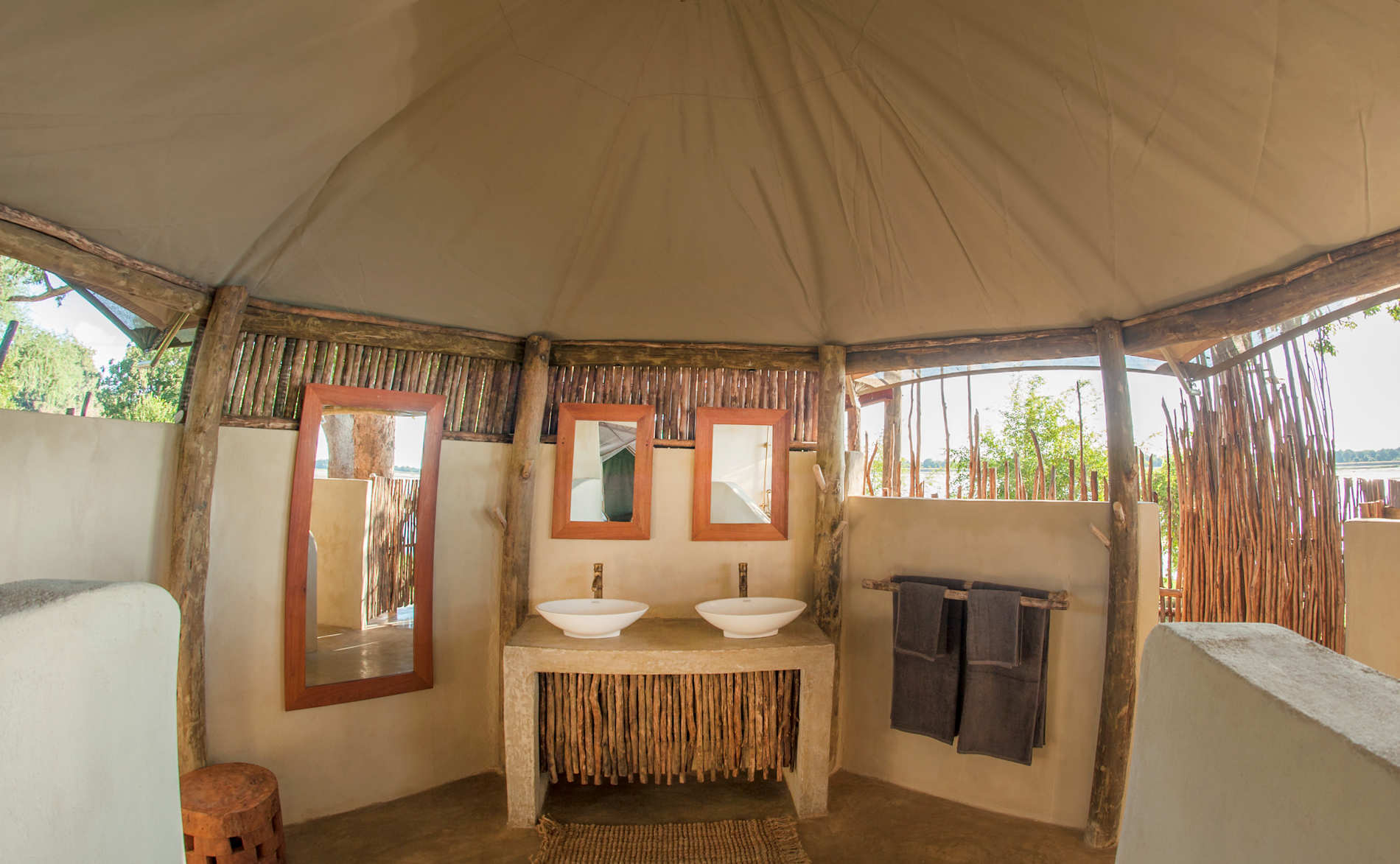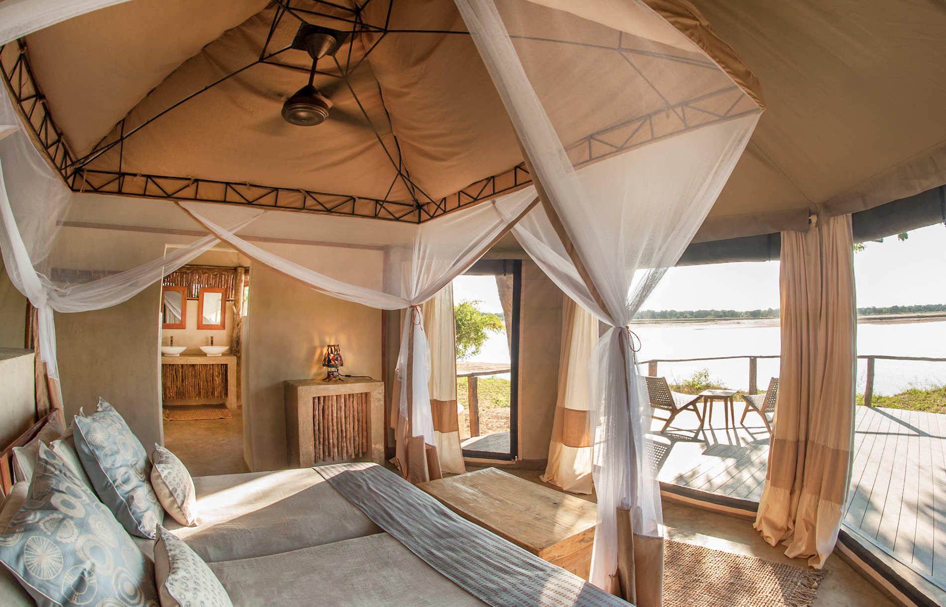 Das Three Rivers Camp ist mit nur fünf geräumigen Zelten, die elegant mit natürlichen Materialien und Erdtönen dekoriert sind, äußerst intim. Die großen, verglasten Fenster bieten einen weiten Blick auf den Luangwa-Fluss und die nahe gelegene Lagune. Jedes Zelt hat eine eigene Holzterrasse mit bequemen Stühlen, auf denen man die Aussicht genießen kann. Die eigenen Badezimmer verfügen über Innen- und Außenduschen, Doppelwaschbecken und Toiletten mit Wasserspülung.